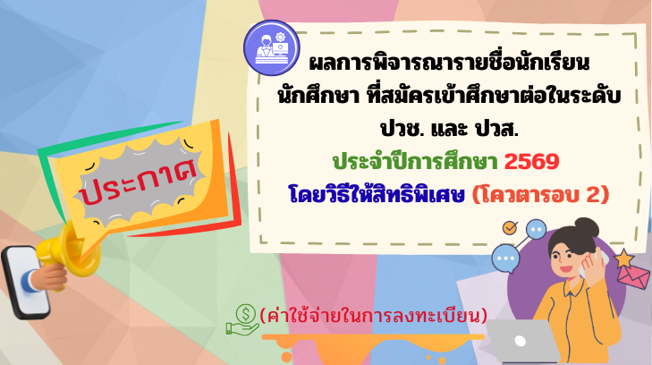 ข่าวประชาสัมพันธ์, ประกาศรับสมัครเรียนผลการพิจารณารายชื่อนักเรียน นักศึกษา ที่สมัครเข้าศึกษาต่อในระดับ ปวช. และ ปวส. ประจำปีการศึกษา 2569 โดยวิธีให้สิทธิพิเศษ (โควตารอบ 2) adminkknicweb / 28 พฤศจิกายน 2025 ประกาศรายชื่อนักเรีย […]