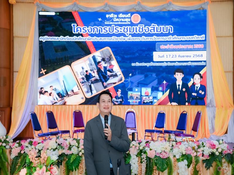 วันอังคารที่ 23 กันยายน 2568 นายลำปางเพ็ชร์ พันธ์เพชร ผู้อำนวยการวิทยาลัยการอาชีพขอนแก่น เป็นประธานในพิธธีเปิดโครงการประชุมเชิงสัมนา ครูนิเทศและนักเรียนนักศึกษาฝึกประสบการณ์วิชาชีพ เพื่อยกระดับการจัดการอาชีวศึกษาระบบทวิภาคี ประจำปีงบประมาณ 2568 เพื่อยกระดับการจัดการอาชีวศึกษาระบบทวิภาคี นักเรียน ระดับ ปวช.3 ที่กลับจากสถานประกอบการ ได้นำเสนอสรุปผลการฝึกประสบการณ์วิชาชีพและฝึกอาชีพในสถานประกอบการฯ ณ ห้องประชุมท้าวแสนแก้ว วิทยาลัยการอาชีพขอนแก่น ดำเนินโครงการโดย งานอาชีวศึกษาระบบทวิภาคี ฝ่ายวิชาการ ณ ห้องประชุมท้าวแสนแก้ว วิทยาลัยการอาชีพขอนแก่น